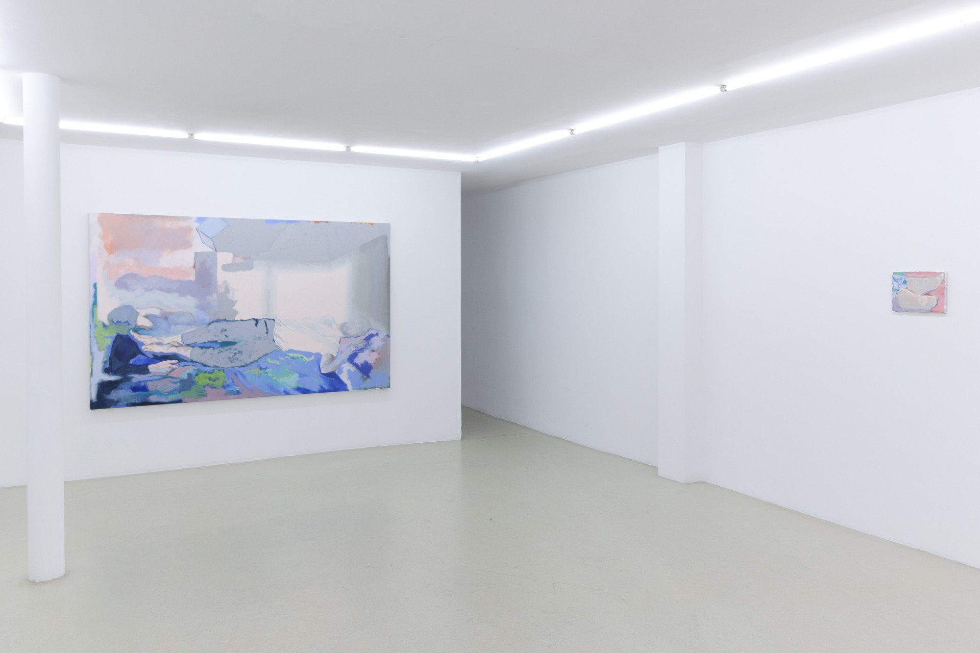 Nuit. Il y a beaucoup de gris, mot bien trop concis pour saisir les épaisseurs de son pluriel. Celles-ci forment un liant qui permet aux teintes pastels des chairs de tenir, tout en célébrant une dimension spectrale. Leurs reflets argentés réveillent des expérimentations argentiques, de ces épidermes touchés par les lueurs même nocturnes.